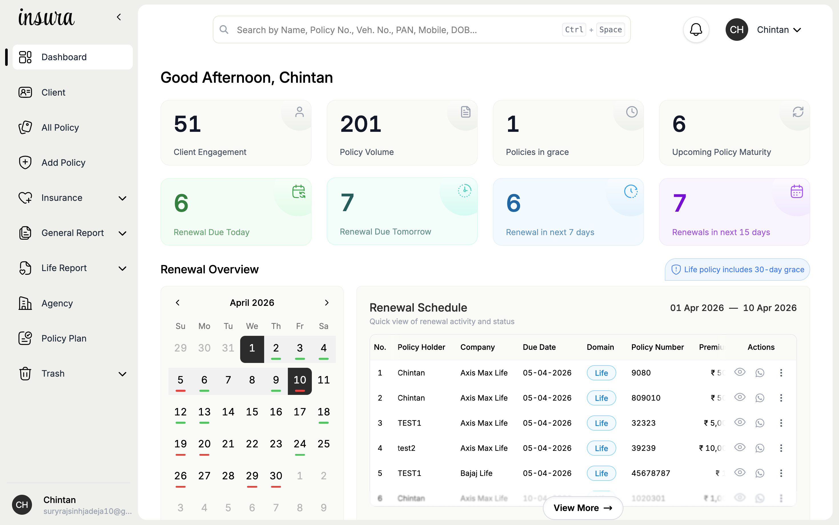 Insura helps you manage clients, track policy statuses (live, renewal, expired), automate reminders, generate reports, and monitor performance through a powerful dashboard—acting as your daily business operating system.